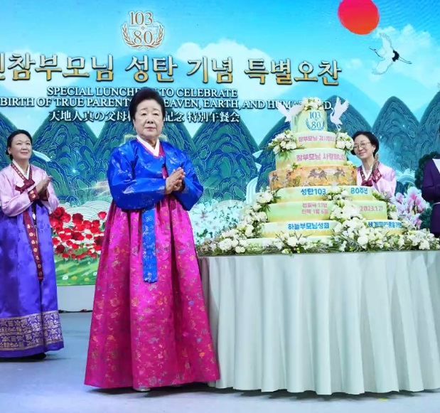 For those of you who are joining us, perhaps for the first time, today, we are celebrating the birth of both our founders, whom we call Father and Mother Moon. They were born on the same lunar day, the sixth day of the first month, in different years – Father Moon in 1920, so he would have been 103, but he passed away 10 years ago – and Mother Moon in 1943. It is her 80th birthday today, her so-called “palsun” in Korean.