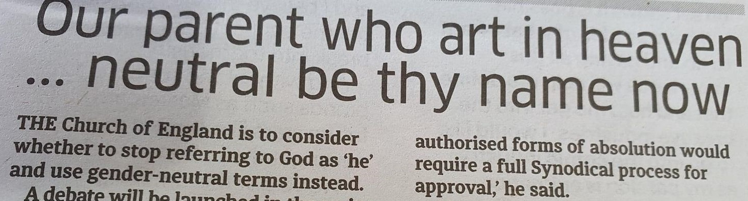 Sky News of Australia writes that – should such changes go through – the most important prayer, the Lord’s Prayer, may then begin with, “‘Our parent’ who art in heaven”.